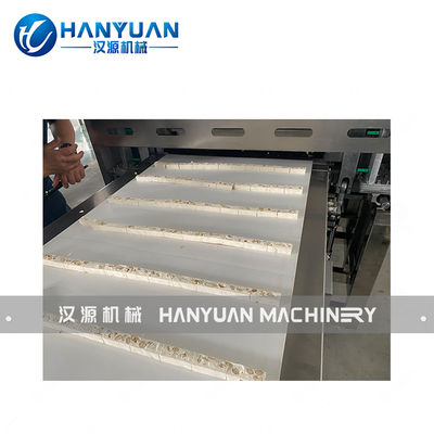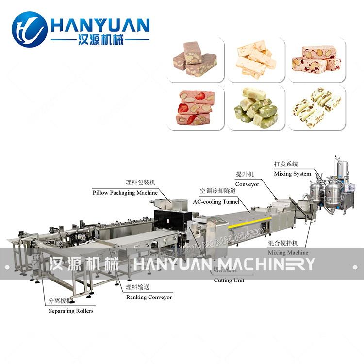 HANYUAN Badam Nougat Candy Processing Line está diseñada para producir varios dulces, incluidos el caramelo, el caramelo púrpura ruso, el nougat, el caramelo de café y el caramelo de aceite de canela.La línea se encarga de cocinar caramelo., mezcla de nueces, formación, enfriamiento, corte y envasado de almohadas.